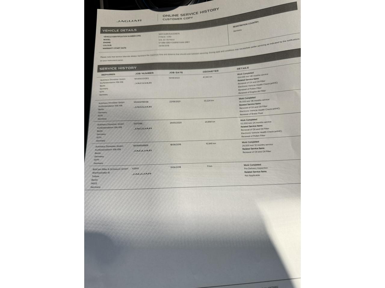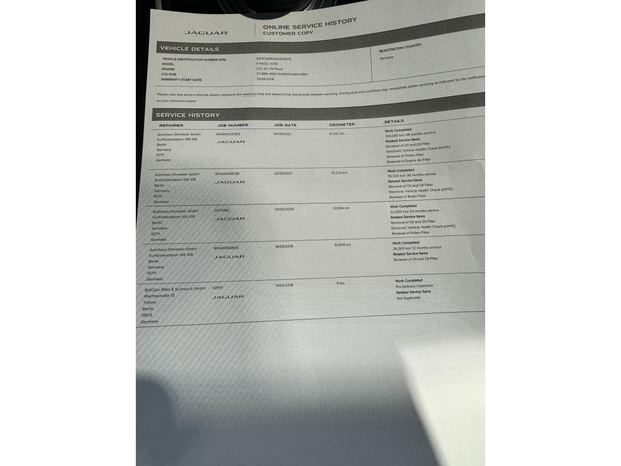 - 1er entretien fait le 18/06/2019 à 10 949Km chez Jaguar.